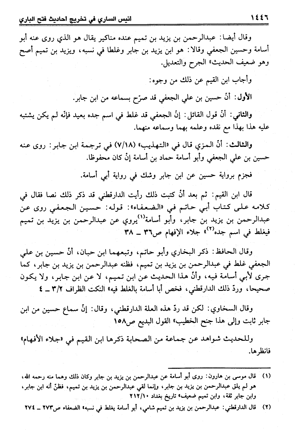 وقال الحافظ: ذكر البخاري وأبو حاتم، وتبعهما ابن حبان، أنّ حسين بن علي الجعفي غلط في عبد الرحمن بن يزيد بن تميم، فظنه عبد الرحمن بن يزيد بن جابر، كما جرى لأبي أسامة فيه، وأنّ هذا الحديث عن ابن تميم، لا عن ابن جابر، ولا يكون صحيحا، وردّ ذلك الدارقطني، فخص أبا أسامة بالغلط فيه" النكت الظراف 2/ 3 - 4