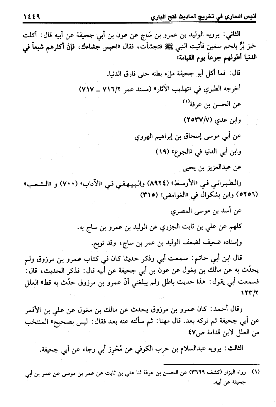 الثاني: يرويه الوليد بن عمرو بن سَاج عن عون بن أبي جحيفة عن أبيه قال: أكلت خبز بُرٍّ بلحم سمين فأتيت النبي - صلى الله عليه وسلم - فتجشأت، فقال "احبس جشاءك، فإنّ أكثرهم شبعاً في الدنيا أطولهم جوعاً يوم القيامة"