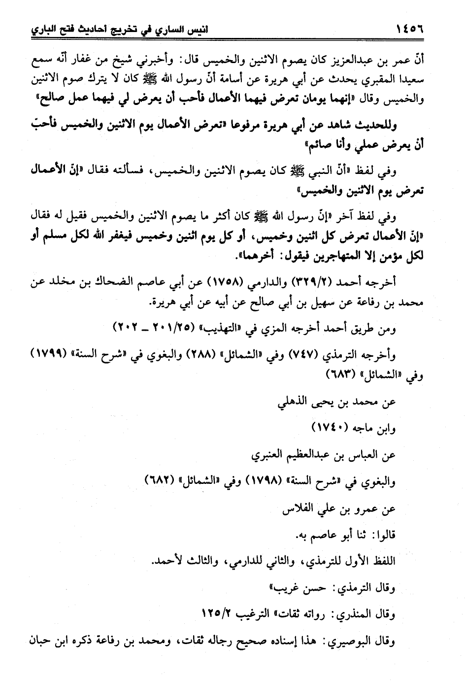 أنّ عمر بن عبد العزيز كان يصوم الاثنين والخميس قال: وأخبرني شيخ من غفار أنّه سمع سعيدا المقبري يحدث عن أبي هريرة عن أسامة أنّ رسول الله - صلى الله عليه وسلم - كان لا يترك صوم الاثنين والخميس وقال "إنهما يومان تعرض فيهما الأعمال فأحب أنّ يعرض لي فيهما عمل صالح"
