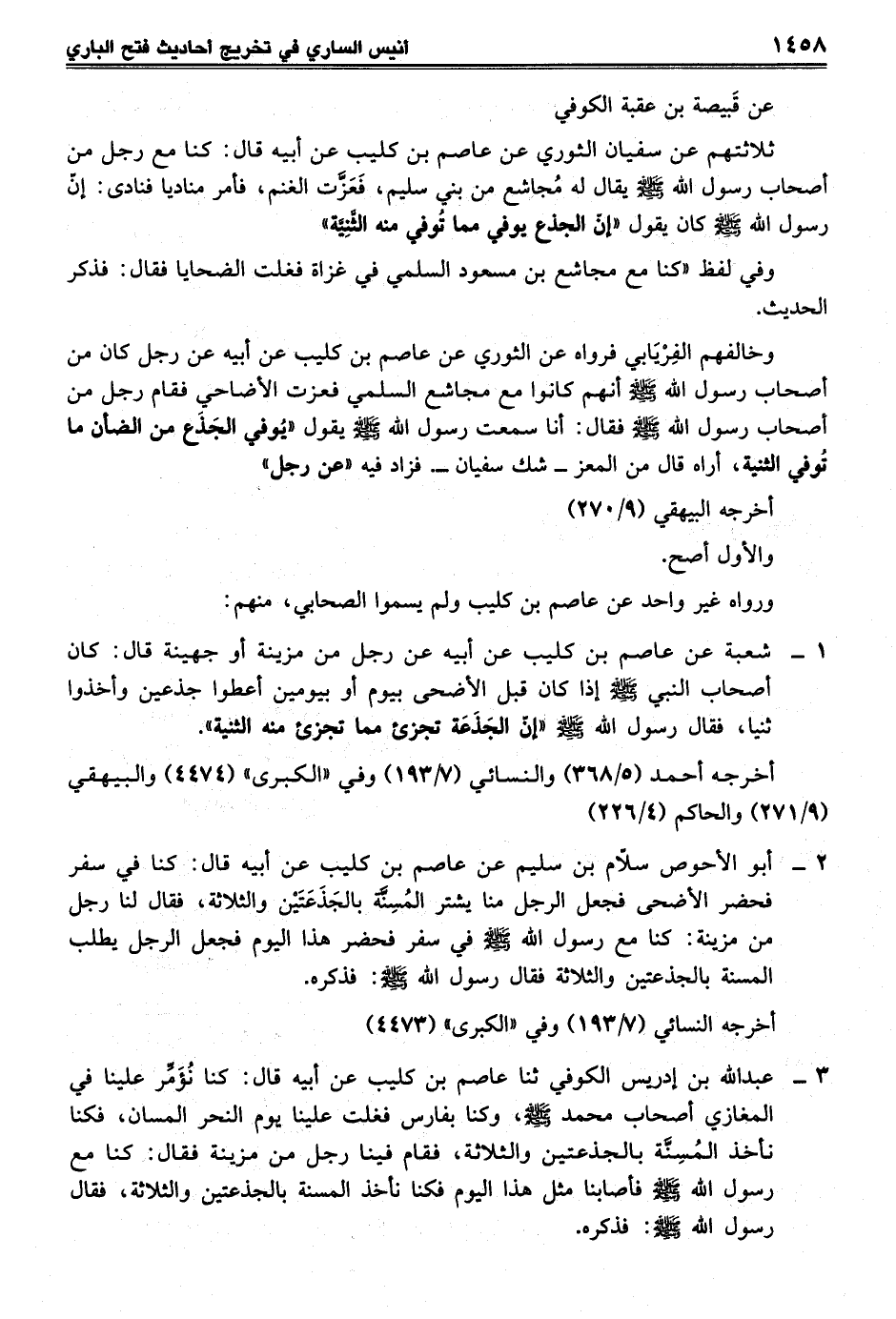 ثلاثتهم عن سفيان الثوري عن عاصم بن كليب عن أبيه قال: كنا مع رجل من أصحاب رسول الله - صلى الله عليه وسلم - يقال له مُجاشع من بني سليم، فَعَزَّت الغنم، فأمر مناديا فنادى: إنّ رسول الله - صلى الله عليه وسلم - كان يقول "إنّ الجذع يوفي مما تُوفي منه الثَّنِيَّة"