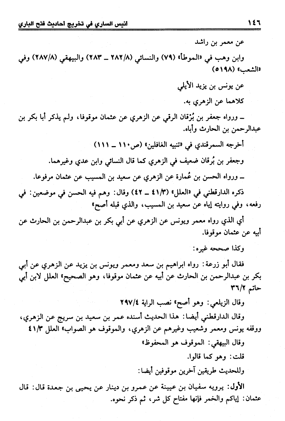 - ورواه جعفر بن بُرْقان الرقي عن الزهري عن عثمان موقوفا، ولم يذكر أبا بكر بن عبد الرحمن بن الحارث وأباه.