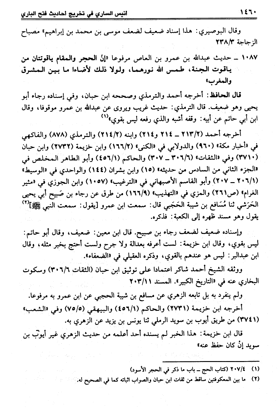 1087 - حديث عبد الله بن عمرو بن العاص مرفوعا "إنّ الحجر والمقام ياقوتتان من ياقوت الجنة، طمسى الله نورهما, ولولا ذلك لأضاءا ما بين المشرق والمغرب"