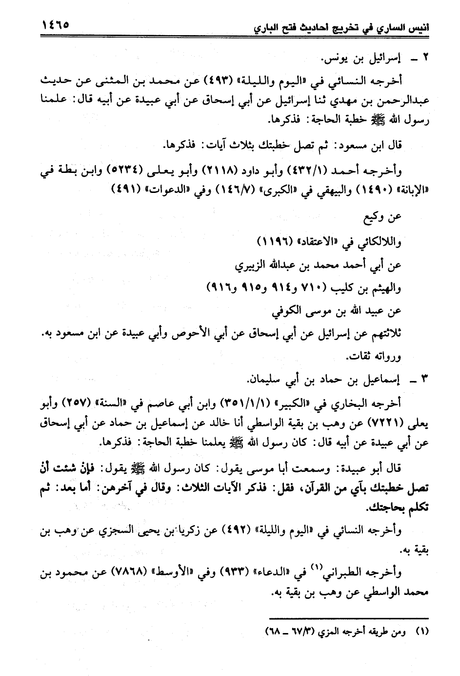أخرجه النسائي في "اليوم والليلة" (493) عن محمد بن المثنى عن حديث عبد الرحمن بن مهدي ثنا إسرائيل عن أبي إسحاق عن أبي عبيدة عن أبيه قال: علمنا رسول الله - صلى الله عليه وسلم - خطبة الحاجة: فذكرها.