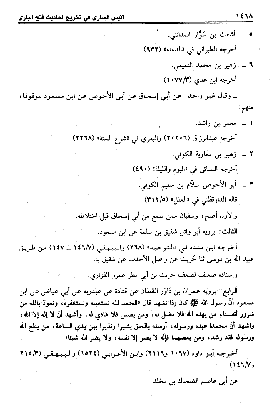 الرابع: يرويه عمران بن دَاوَر القطان عن قتادة عن عبد ربه عن أبي عياض عن ابن مسعود أنّ رسول الله - صلى الله عليه وسلم - كان إذا تشهد قال "الحمد لله نستعينه ونستغفره، ونعوذ بالله من شرور أنفسنا، من يهده الله فلا مضل له، ومن يضلل فلا هادي له، وأشهد أنْ لا إله إلا الله، واشهد أنّ محمدا عبده ورسوله، أرسله بالحق بشيرا ونذيرا بين يدي الساعة، من يطع الله ورسوله فقد رشد، ومن يعصهما فإنّه لا يضر إلا نفسه، ولا يضر الله شيئا"