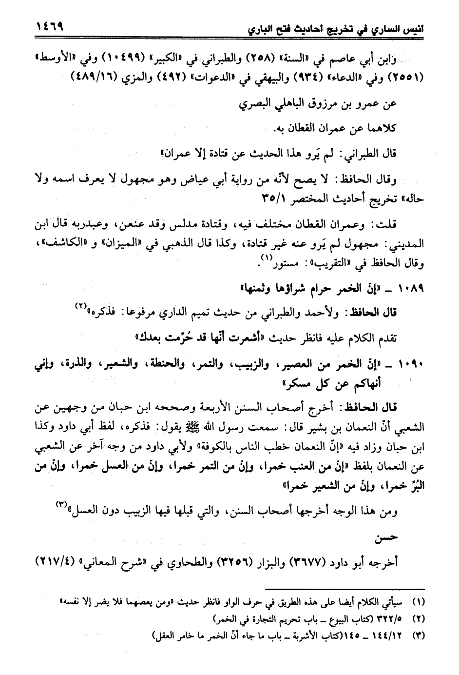 قال الحافظ: أخرج أصحاب السنن الأربعة وصححه ابن حبان من وجهين عن الشعبي أنّ النعمان بن بشير قال: سمعت رسول الله - صلى الله عليه وسلم - يقول: فذكره، لفظ أبي داود وكذا ابن حبان وزاد فيه "إن النعمان خطب الناس بالكوفة" ولأبي داود من وجه آخر عن الشعبي عن النعمان بلفظ "إنّ من العنب خمرا، وإنّ من التمر خمرا، وإنّ من العسل خمرا، وإنّ من البُرِّ خمرا، وإنّ من الشعير خمرا"