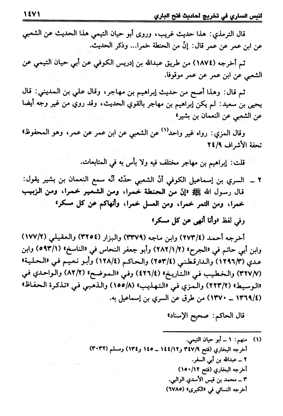 2 - السري بن إسماعيل الكوفي أنّ الشعبي حدّثه أنّه سمع النعمان بن بشير يقول: قال رسول الله - صلى الله عليه وسلم - "إنّ من الحنطة خمرا، ومن الشعير خمرا، ومن الزبيب خمرا، ومن التمر خمرا، ومن العسل خمرا، وأنهاكم عن كل مسكر"