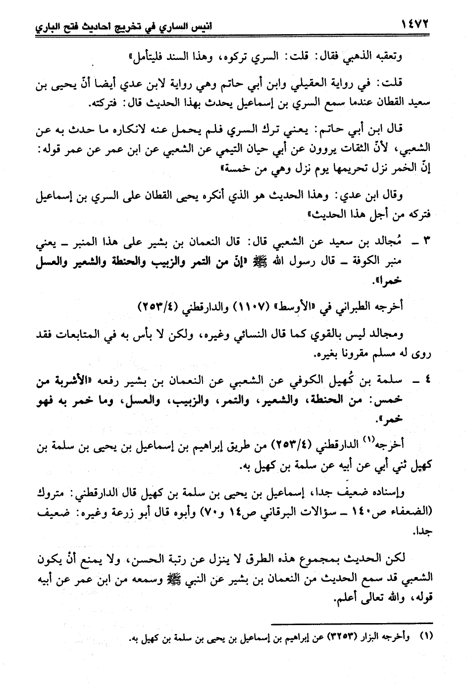 4 - سلمة بن كُهيل الكوفي عن الشعبي عن النعمان بن بشير رفعه "الأشربه من خمس: من الحنطة، والشعير، والتمر، والزبيب، والعسل، وما خمر به فهو خمر".