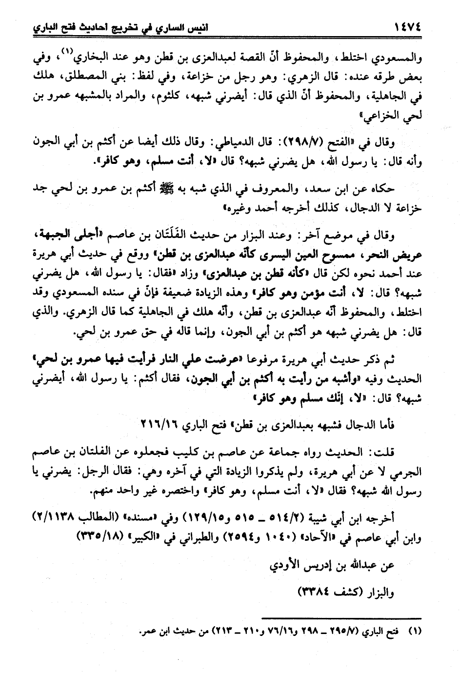 وقال في موضع آخر: وعند البزار من حديث الفَلَتَان بن عاصم "أجلى الجبهة، عريض النحر، ممسوح العين اليسرى كأنّه عبد العزى بن قطن" ووقع في حديث أبي هريرة عند أحمد نحوه لكن قال "كأنه قطن بن عبد العزى" وزاد "فقال: يا رسول الله، هل يضرني شبهه؟ قال: لا، أنت مؤمن وهو كافر" وهذه الزيادة ضعيفة فإنّ في سنده المسعودي وقد اختلط، والمحفوظ أنّه عبد العزى بن قطن، وأنّه هلك في الجاهلية كما قال الزهري. والذي قال: هل يضرني شبهه هو أكثم بن أبي الجون، وإنما قاله في حق عمرو بن لحي.