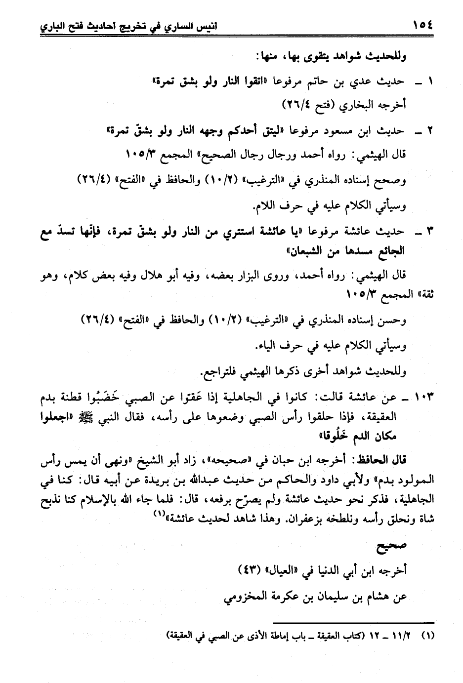 قال الحافظ: أخرجه ابن حبان في "صحيحه" زاد أبو الشيخ "ونهى أن يمس رأس المولود بدم" ولأبي داود والحاكم من حديث عبد الله بن بريدة عن أبيه قال: كنا في الجاهلية، فذكر نحو حديث عائشة ولم يصرّح برفعه، قال: فلما جاء الله بالإسلام كنا نذبح شاة ونحلق رأسه ونلطخه بزعفران. وهذا شاهد لحديث عائشة" (¬1)
