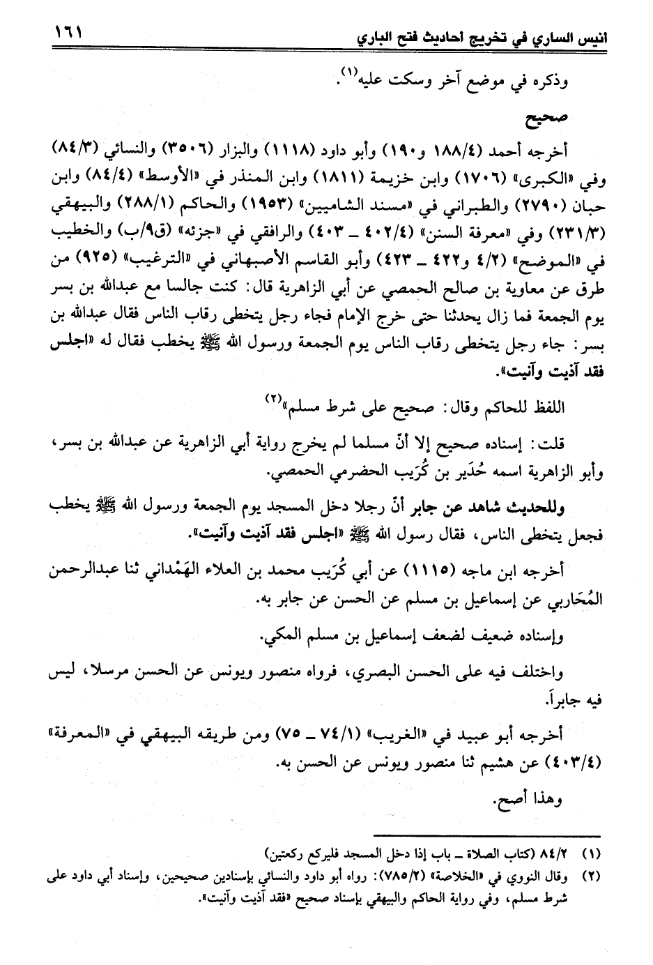 أخرجه أحمد (4/ 188 و 190) وأبو داود (1118) والبزار (3506) والنسائي (3/ 84) وفي "الكبرى" (1706) وابن خزيمة (1811) وابن المنذر في "الأوسط" (4/ 84) وابن حبان (2790) والطبراني في "مسند الشاميين" (1953) والحاكم (1/ 288) والبيهقي (3/ 231) وفي "معرفة السنن" (4/ 402 - 403) والرافقي في "جزئه" (ق 9/ ب) والخطيب في "الموضح" (4/ 2 و 422 - 423) وأبو القاسم الأصبهاني في "الترغيب" (925) من طرق عن معاوية بن صالح الحمصي عن أبي الزاهرية قال: كنت جالسا مع عبد الله بن بسر يوم الجمعة فما زال يحدثنا حتى خرج الإمام فجاء رجل يتخطى رقاب الناس فقال عبد الله بن بسر: جاء رجل يتخطى رقاب الناس يوم الجمعة ورسول الله - صلى الله عليه وسلم - يخطب فقال له "اجلس فقد آذيت وآنيت".