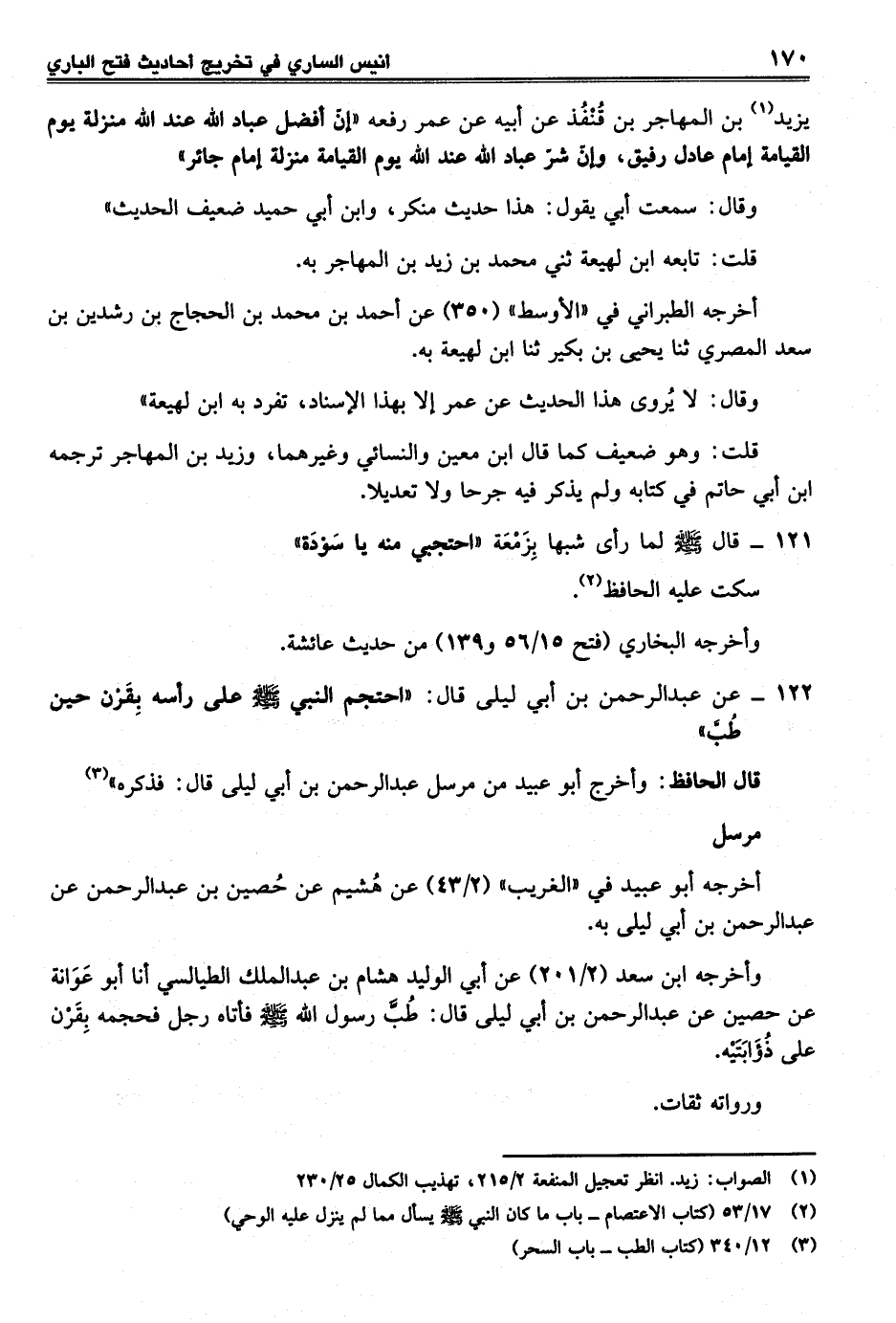 122 - عن عبد الرحمن بن أبي ليلى قال: "احتجم النبي - صلى الله عليه وسلم - على رأسه بقَرْن حين
