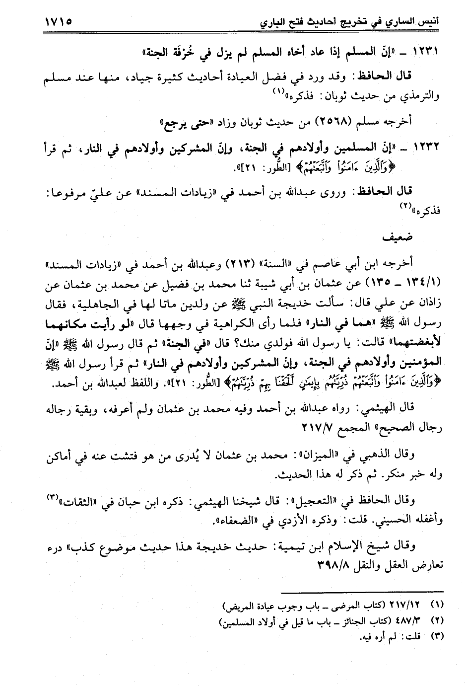 1232 - "إنّ المسلمين وأِولادهم في الجنة، وإن المشركين وأولادهم في النار، ثم قرأ {وَالَّذِينَ آمَنُوا وَاتَّبَعَتْهُمْ} [الطُور: 21] ".