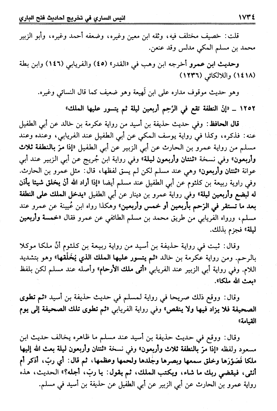 قال الحافظ: وفي حديث حذيفة بن أسيد من رواية عكرمة بن خالد عن أبي الطفيل عنه: فذكره، وكذا في رواية يوسف المكي عن أبي الطفيل عند الفريابي، وعنده وعند مسلم من رواية عمرو بن الحارث عن أبي الزبير عن أبي الطفيل "إذا مرّ بالنطفة ثلاث وأربعون" وفي نسخة "ثنتان وأربعون ليلة" وفي رواية ابن جُريج عن أبي الزبير عند أبي عوانة "ثنتان وأربعون" وهي عند مسلم لكن لم يسق لفظها، قال: مثل عمرو بن الحارث. وفي راوية ربيعة بن كلثوم عن أبي الطفيل عند مسلم أيضا "إذا أراد الله أنْ يخلق شيئًا يأذن له لبضع وأربعين ليلة" وفي رواية عمرو بن دينار عن أبي الطفيل "يدخل الملك على النطفة بعد ما تستقر في الرحم بأربعين أو خمس وأربعين" وهكذا رواه ابن عُيينة عن عمرو عند مسلم، ورواه الفريابي من طريق محمد بن مسلم الطائفي عن عمرو فقال "خمسة وأربعين ليلة" فجزم بذلك.
