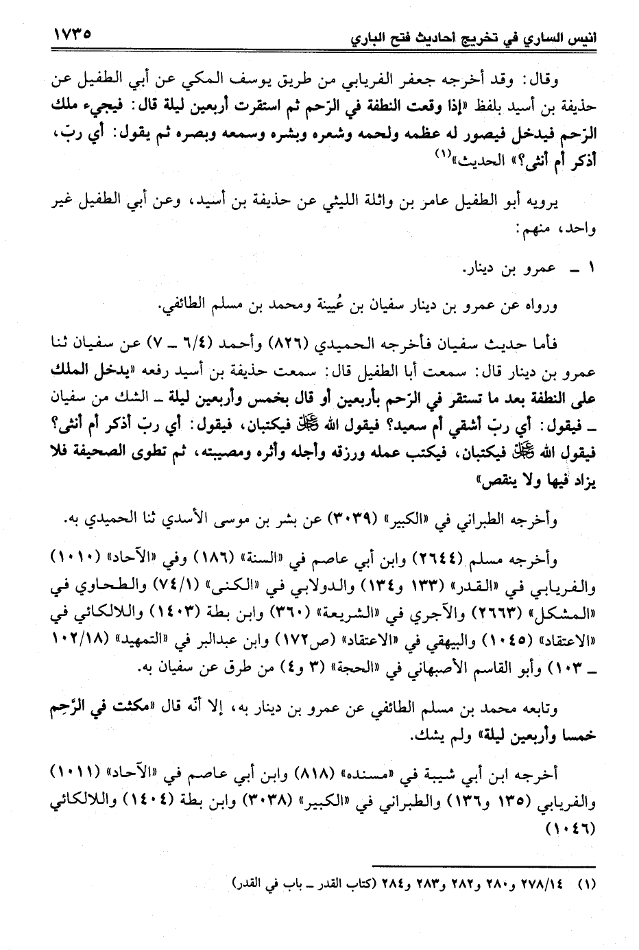 وقال: وقد أخرجه جعفر الفريابي من طريق يوسف المكي عن أبي الطفيل عن حذيفة بن أسيد بلفظ "إذا وقعت النطفة في الرحم ثم استقرت أربعين ليلة قال: فيجيء ملك الرحم فيدخل فيصور له عظمه ولحمه وشعره وبشره وسمعه وبصره ثم يقول: أي ربّ، أذكر أم أنثى؟ " الحديث" (¬1)
