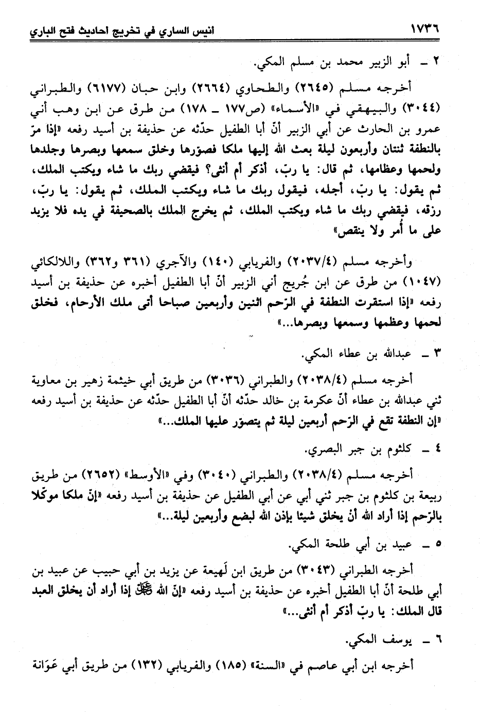 وأخرجه مسلم (4/ 2037) والفريابي (140) والآجري (361 و 362) واللالكائي (1047) من طرق عن ابن جُريج أني الزبير أنْ أبا الطفيل أخبره عن حذيفة بن أسيد رفعه "إذا استقرت النطفة في الرّحم اثنين وأربعين صباحا أتى ملك الأرحام، فخلق لحمها وعظمها وسمعها وبصرها ... "