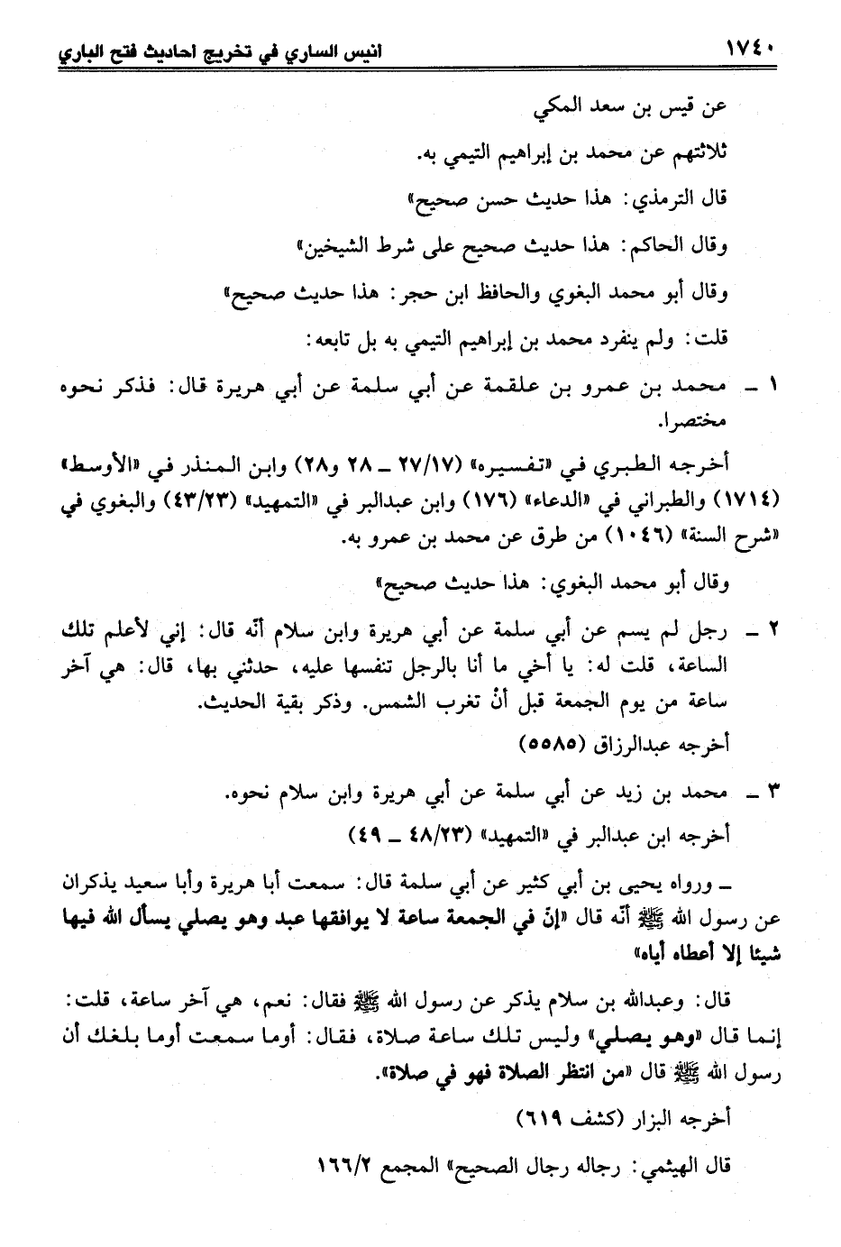 قال: وعبد الله بن سلام يذكر عن رسول الله - صلى الله عليه وسلم - فقال: نعم، هي آخر ساعة، قلت: إنما قال "وهو يصلي" وليس تلك ساعة صلاة، فقال: أوما سمعت أوما بلغك أن رسول الله - صلى الله عليه وسلم - قال "من انتظر الصلاة فهو في صلاة".