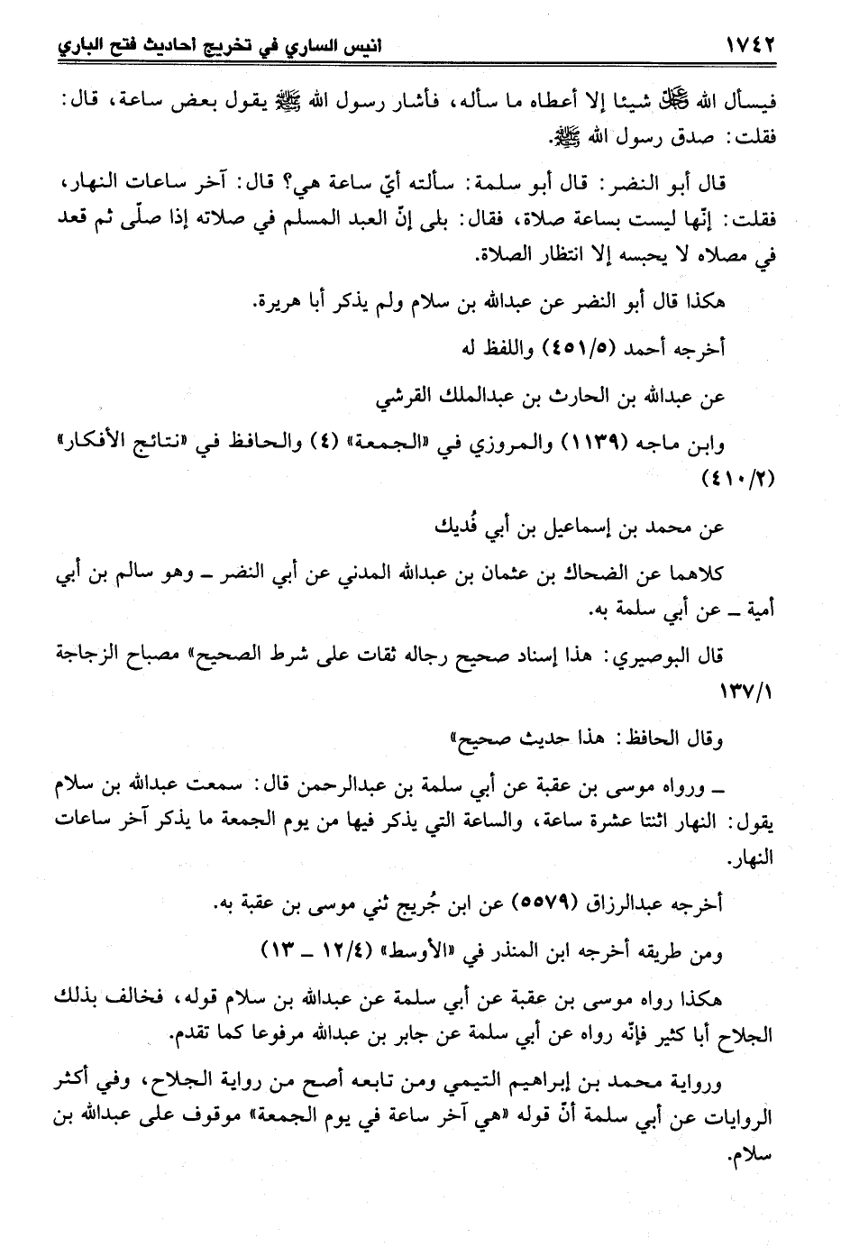 ورواية محمد بن إبراهيم التيمي ومن تابعه أصح من رواية الجلاح، وفي أكثر الروايات عن أبي سلمة أن قوله: هي آخر ساعة في يوم الجمعة" موقوف على عبد الله بن سلام.