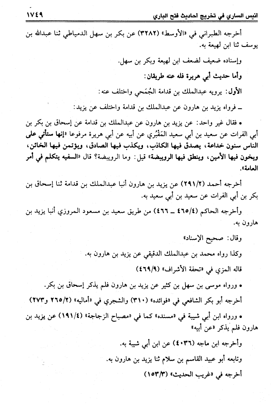 • فقال غير واحد: عن يزيد بن هارون عن عبد الملك بن قدامة عن إسحاق بن بكر بن أبي الفرات عن سعيد بن أبي سعيد المَقْبُري عن أبيه عن أبي هريرة مرفوعا "إنها ستأتي على الناس سنون خداعة، يصدق فيها الكاذب، ويكذب فيها الصادق، ويؤتمن فيها الخائن، ويخون فيها الأمين، وينطق فيها الرويبضة" قيل: وما الرويبضة؟ قال "السفيه يتكلم في أمر العامة".