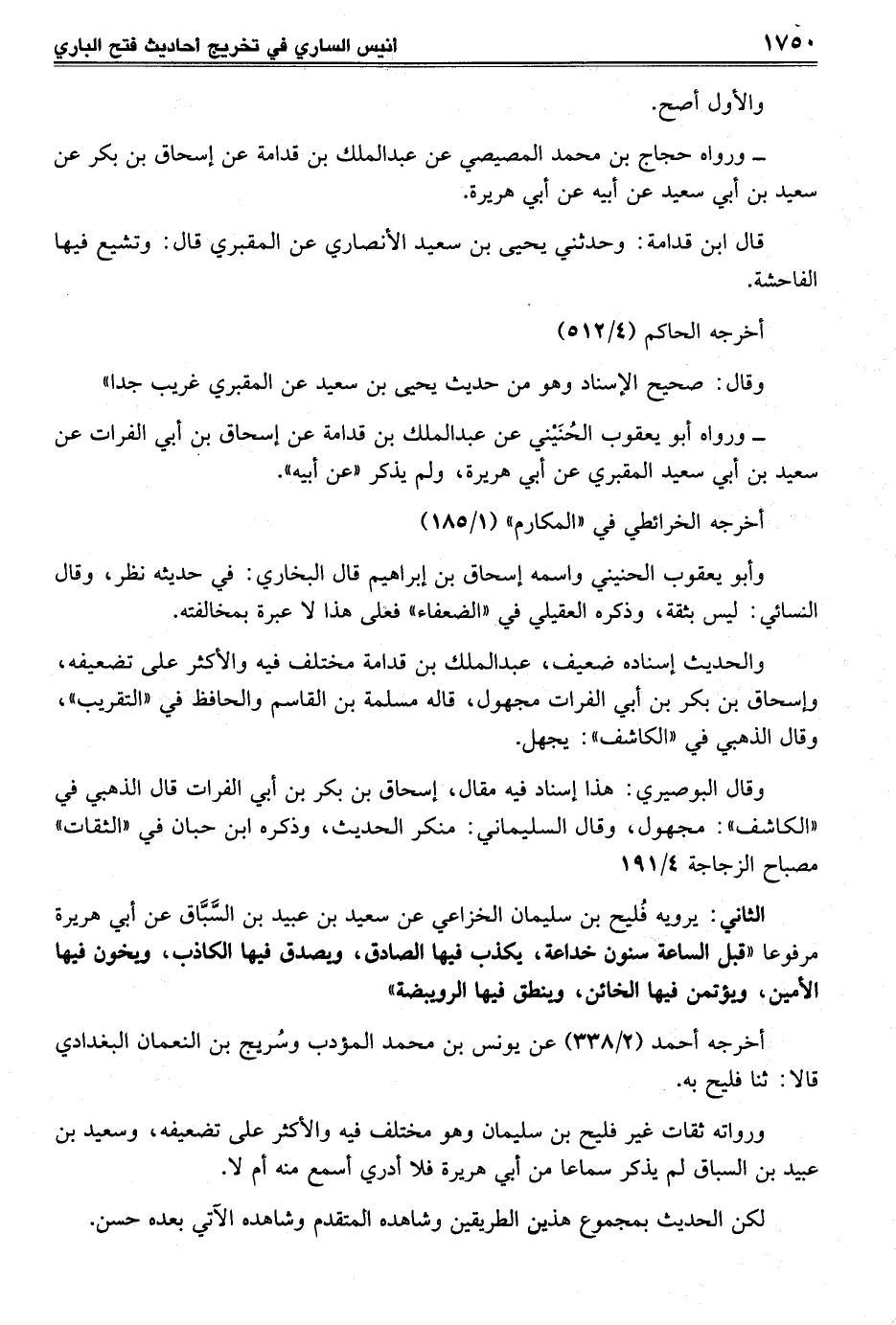 - ورواه أبو يعقوب الحُنَيْني عن عبد الملك بن قدامة عن إسحاق بن أبي الفرات عن سعيد بن أبي سعيد المقبري عن أبي هريرة، ولم يذكر "عن أبيه".
