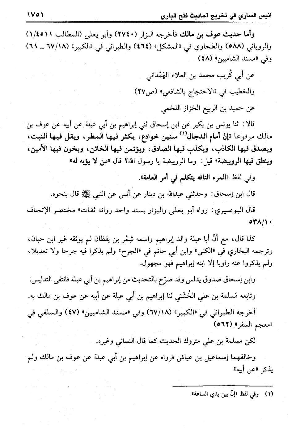 قالا: ثنا يونس بن بكير عن ابن إسحاق ثني إبراهيم بن أبي عبلة عن أبيه عن عوف بن مالك مرفوعا "إنّ أمام الدجال (¬1) سنين خوادع، يكثر فيها المطر، ويقل فيها النبت، ويصدق فيها الكاذب، ويكذب فيها الصادق، ويؤتمن فيها الخائن، ويخون فيها الأمين، وينطق فيها الرويبضة" قيل: وما الرويبضة يا رسول الله؟ قال "من لا يؤبه له"