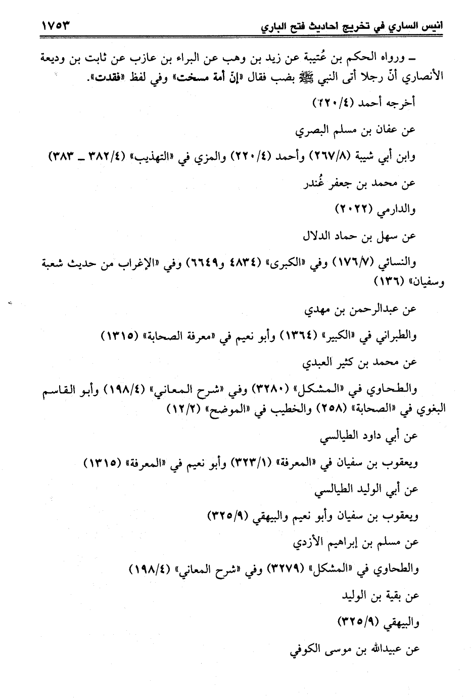 - ورواه الحكم بن عُتيبة عن زيد بن وهب عن البراء بن عازب عن ثابت بن وديعة الأنصاري أن رجلا أتى النبي - صلى الله عليه وسلم - بضب فقال "إنّ أمة مسخت" وفي لفظ فقدت".