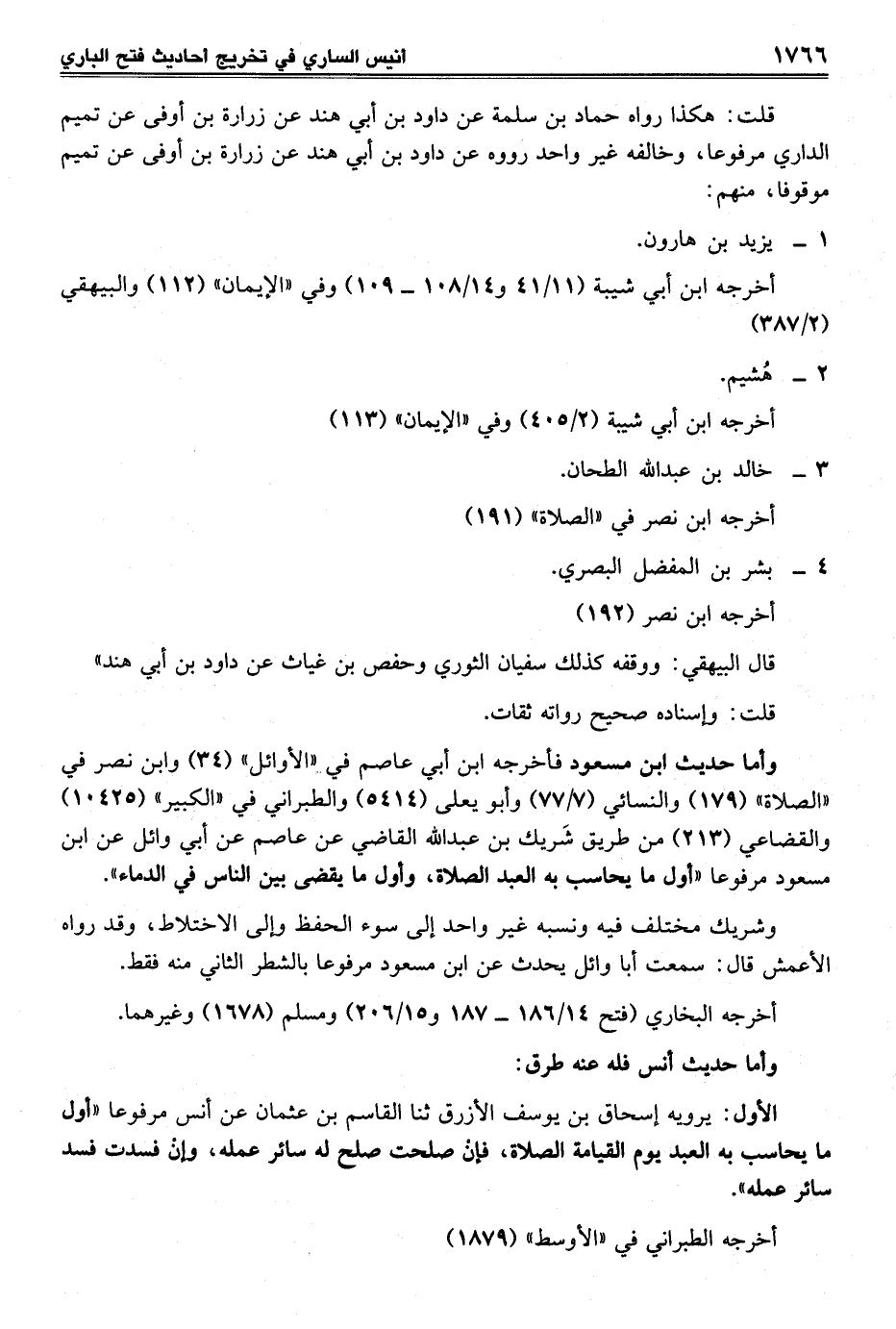 الأول: يرويه إسحاق بن يوسف الأزرق ثنا القاسم بن عثمان عن أنس مرفوعا "أول ما يحاسب به العبد يوم القيامة الصلاة، فإنْ صلحت صلح له سائر عمله، وإنْ فسدت فسد سائر عمله".