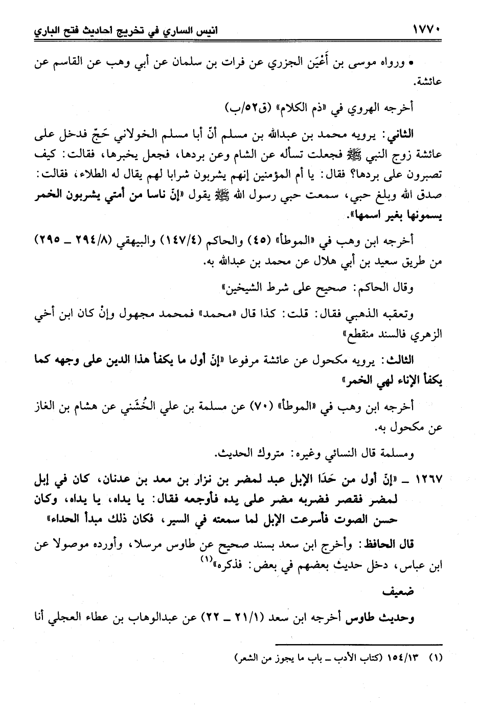 الثاني: يرويه محمد بن عبد الله بن مسلم أن أبا مسلم الخولاني حَجّ فدخل على عائشة زوج النبي -صلي الله عليه وسلم - فجعلت تسأله عن الشام وعن بردها، فجعل يخبرها، فقالت: كيف تصبرون على بردها؟ فقال: يا أم المؤمنين إنهم يشربون شرابا لهم يقال له الطلاء، فقالت: صدق الله وبلغ حبي، سمعت حبي رسول الله -صلي الله عليه وسلم - يقول "إنّ ناسا من أمتي يشربون الخمر يسمونها بغير اسمها".