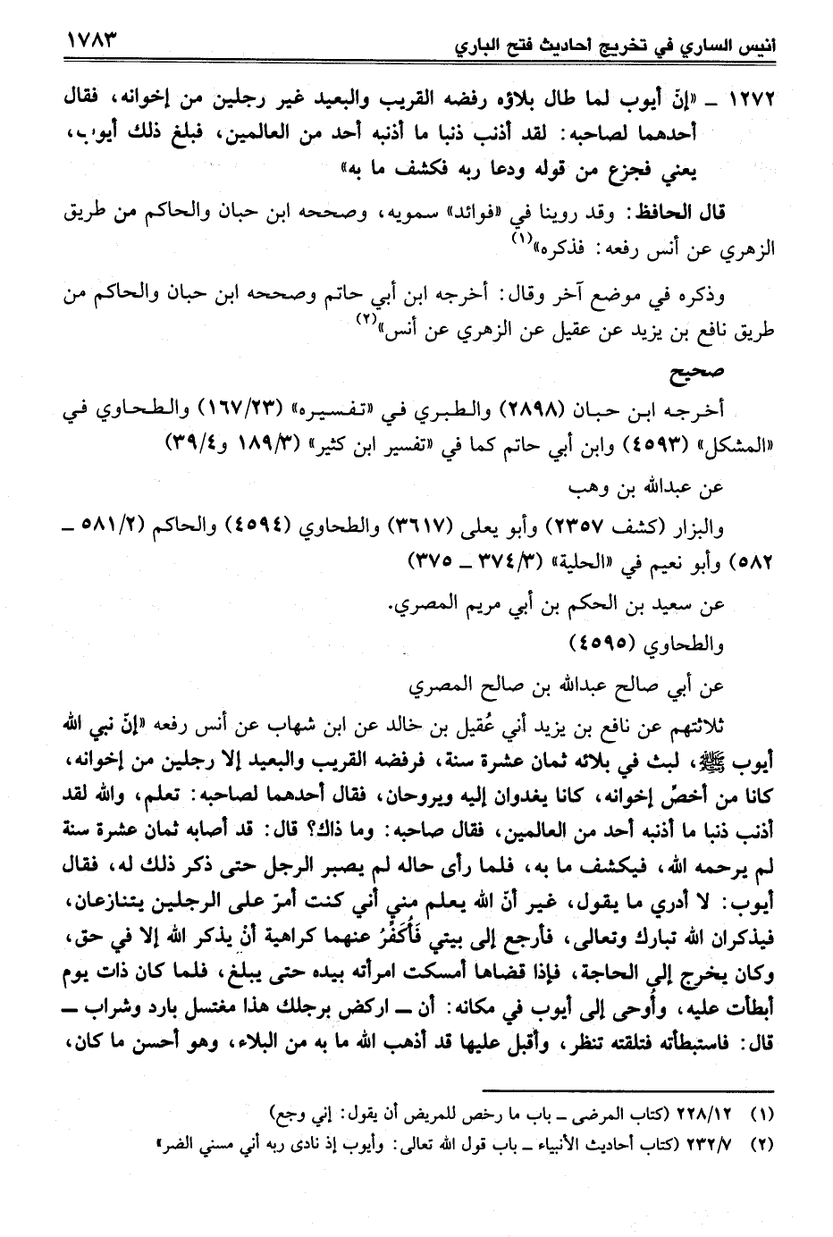 1272 - "إنّ أيوب لما طال بلاؤه رفضه القريب والبعيد غير رجلين من إخوانه، فقال أحدهما لصاحبه: لقد أذنب ذنبا ما أذنبه أحد من العالمين، فبلغ ذلك أيوب، يعني فجزع من قوله ودعا ربه فكشف ما به"