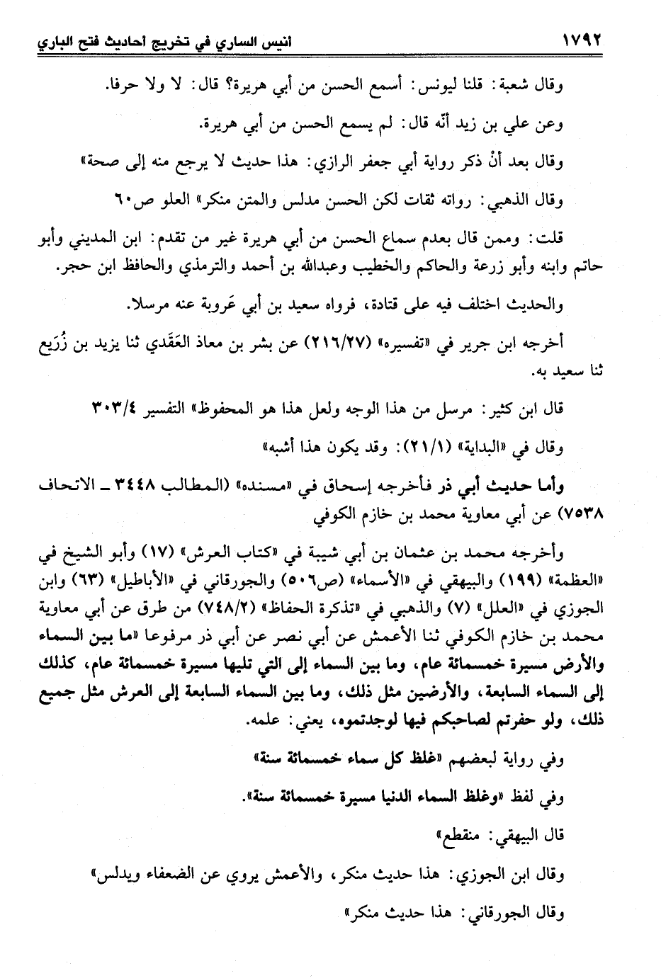 وأخرجه محمد بن عثمان بن أبي شيبة في "كتاب العرش" (17) وأبو الشيخ في "العظمة" (199) والبيهقي في "الأسماء" (ص 506) والجورقاني في "الأباطيل" (63) وابن الجوزي في "العلل" (7) والذهبي في "تذكرة الحفاظ" (2/ 748) من طرق عن أبي معاوية محمد بن خازم الكوفي ثنا الأعمش عن أبي نصر عن أبي ذر مرفوعا "ما بين السماء والأرض مسيرة خمسمائة عام، وما بين السماء إلى التي تليها مسيرة خمسمائة عام، كذلك إلى السماء السابعة، والأرضين مثل ذلك، وما بين السماء السابعة إلى العرش مثل جميع ذلك، ولو حفرتم لصاحبكم فيها لوجدتموه، يعني: علمه.