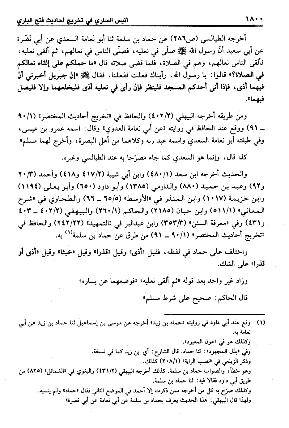 أخرجه الطيالسي (ص 286) عن حماد بن سلمة ثنا أبو نَعامة السعدي عن أبي نَضْرة عن أبي سعيد أنّ رسول الله -صلي الله عليه وسلم - صلّى في نعليه، فصلّى الناس في نعالهم، ثم ألقى نعليه، فألقى الناس نعالهم، وهم في الصلاة، فلما قضى صلاته قال "ما حملكم على إلقاء نعالكم في الصلاة؟ " قالوا: يا رسول الله، رأيناك فعلت ففعلنا، فقال - صلى الله عليه وسلم - إن جبريل أخبرني أنّ فيهما أذى، فإذا أتى أحدكم المسجد فلينظر فإنّ رأى في نعليه أذى فليخلعهما وإلا فليصل فيهما".