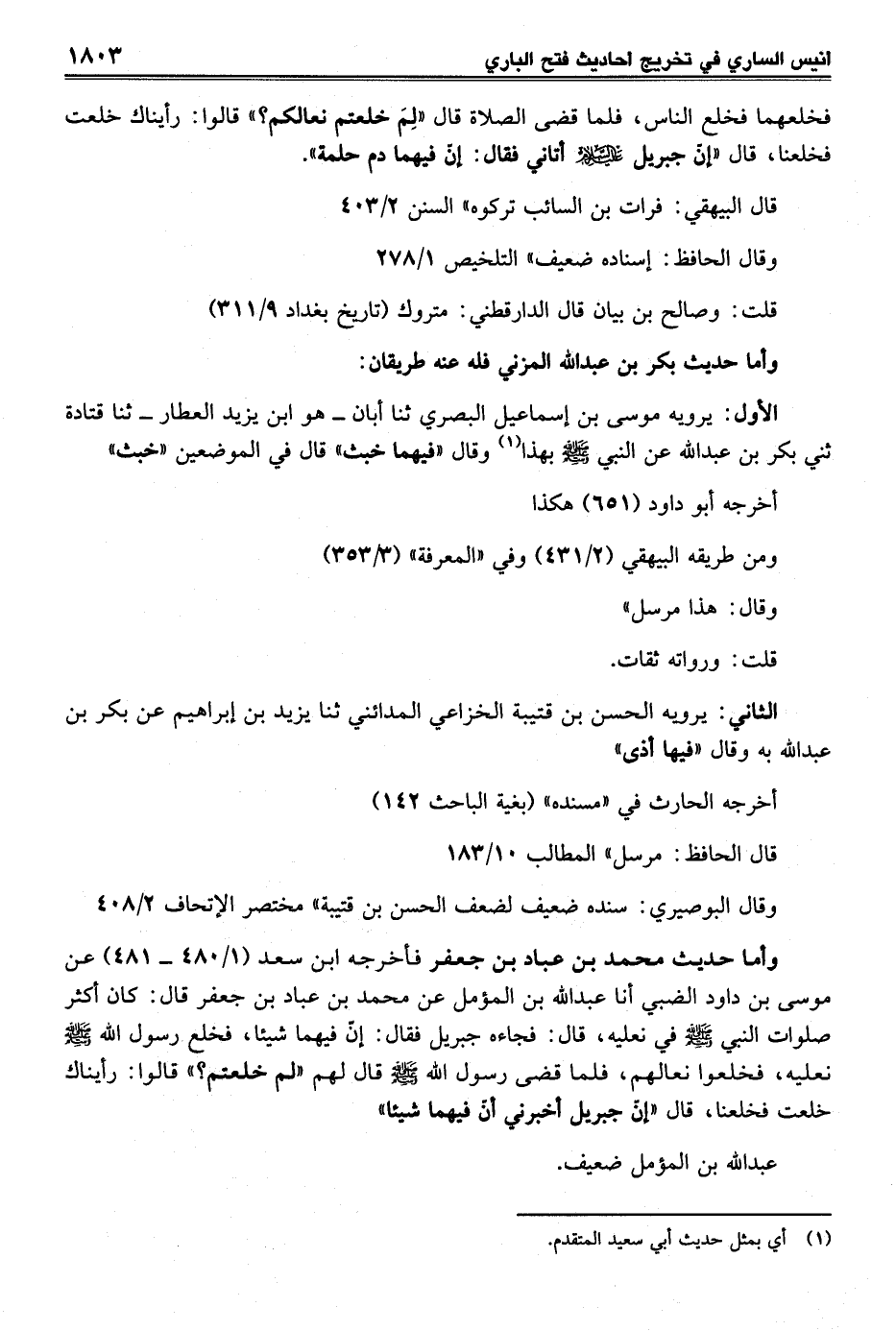 وأما حديث محمد بن عباد بن جعفر فأخرجه ابن سعد (1/ 480 - 481) عن موسى بن داود الضبى أنا عبد الله بن المؤمل عن محمد بن عباد بن جعفر قال: كان أكثر صلوات النبي -صلي الله عليه وسلم - في نعليه، قال: فجاءه جبريل فقال: إنّ فيهما شيئاً، فخلع رسول الله -صلي الله عليه وسلم - نعليه، فخلعوا نعالهم، فلما قضى رسول الله -صلي الله عليه وسلم - قال لهم "لم خلعتم؟ " قالوا: رأيناك خلعت فخلعنا، قال "إنّ جبريل أخبرني أنّ فيهما شيئاً"