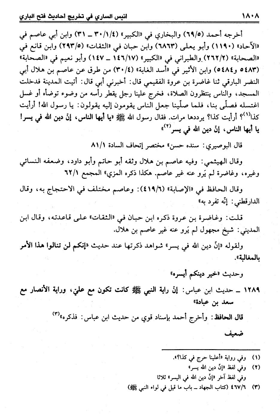 أخرجه أحمد (5/ 69) والبخاري في "الكبير" (4/ 1/ 30 - 31) وابن أبي عاصم في "الآحاد" (1190) وأبو يعلى (6863) وابن حبان في "الثقات" (5/ 293) وابن قانع في "الصحابة" (2/ 262) والطبراني في "الكبير" (17/ 146 - 147) وأبو نعيم في "الصحابة" (5483 و 5484) وابن الأثير في "أسد الغابة" (4/ 30) من طرق عن عاصم بن هلال أبي النضر البارقي ثنا غاضرة بن عروة الفقيمي قال: أخبرني أبي قال: أتيت المدينة فدخلت المسجد، والناس ينتظرون الصلاة، فخرج علينا رجل يقطر رأسه من وضوء توضأه أو غسل اغتسله فصلّى بنا، فلما صلّينا جعل الناس يقومون إليه يقولون: يا رسول الله! أرأيت كذا (¬1)؟ أرأيت كذا؟ يرددها مرات. فقال رسول الله - صلى الله عليه وسلم - "يا أيها الناس، إنّ دين الله في يسر! يا أيها الناس، إنّ دين الله في يسر (¬2) "