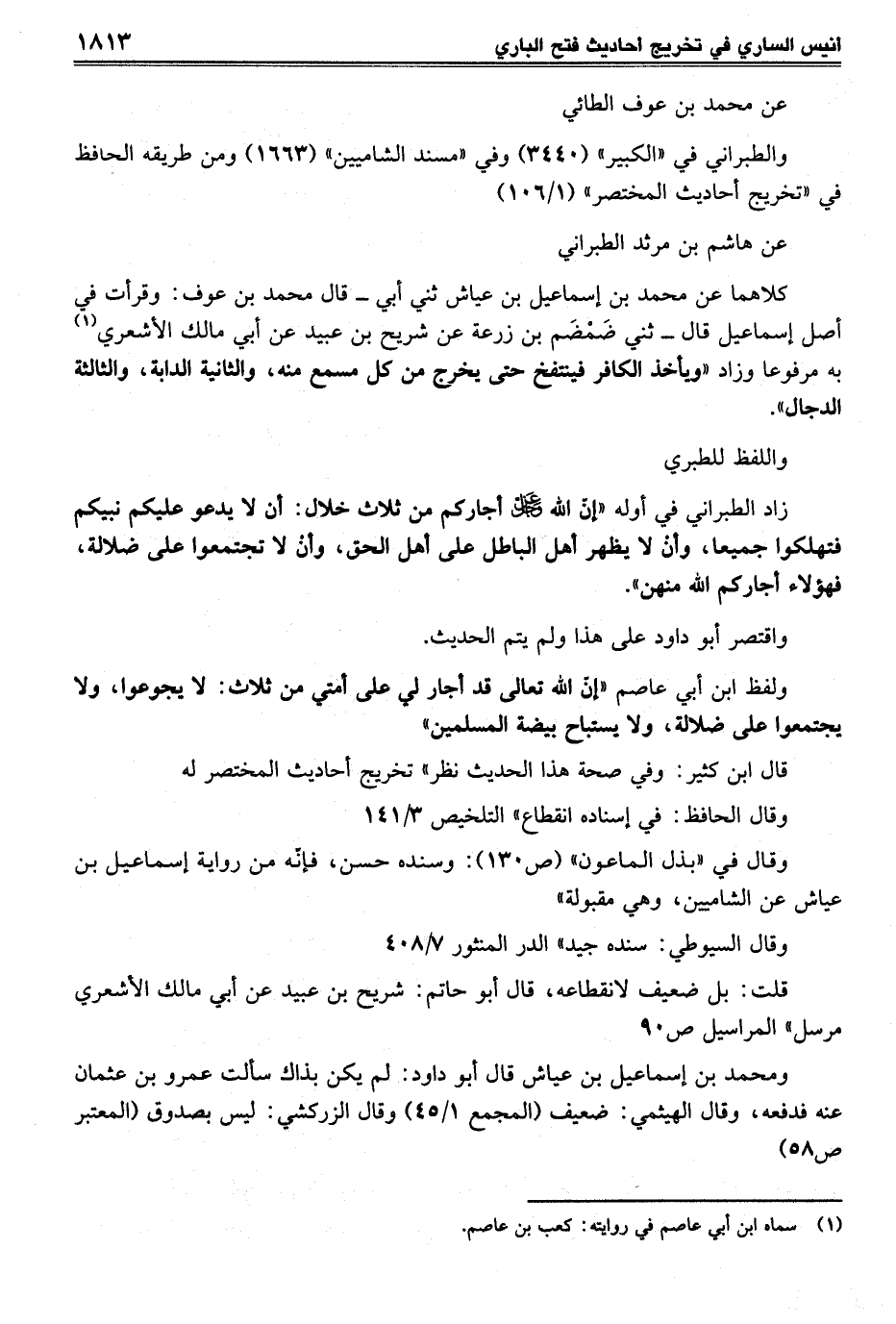 ومحمد بن إسماعيل بن عياش قال أبو داود: لم يكن بذاك سألت عمرو بن عثمان عنه فدفعه، وقال الهيثمي: ضعيف (المجمع 1/ 45) وقال الزركشي: ليس بصدوق (المعتبر ص 58)