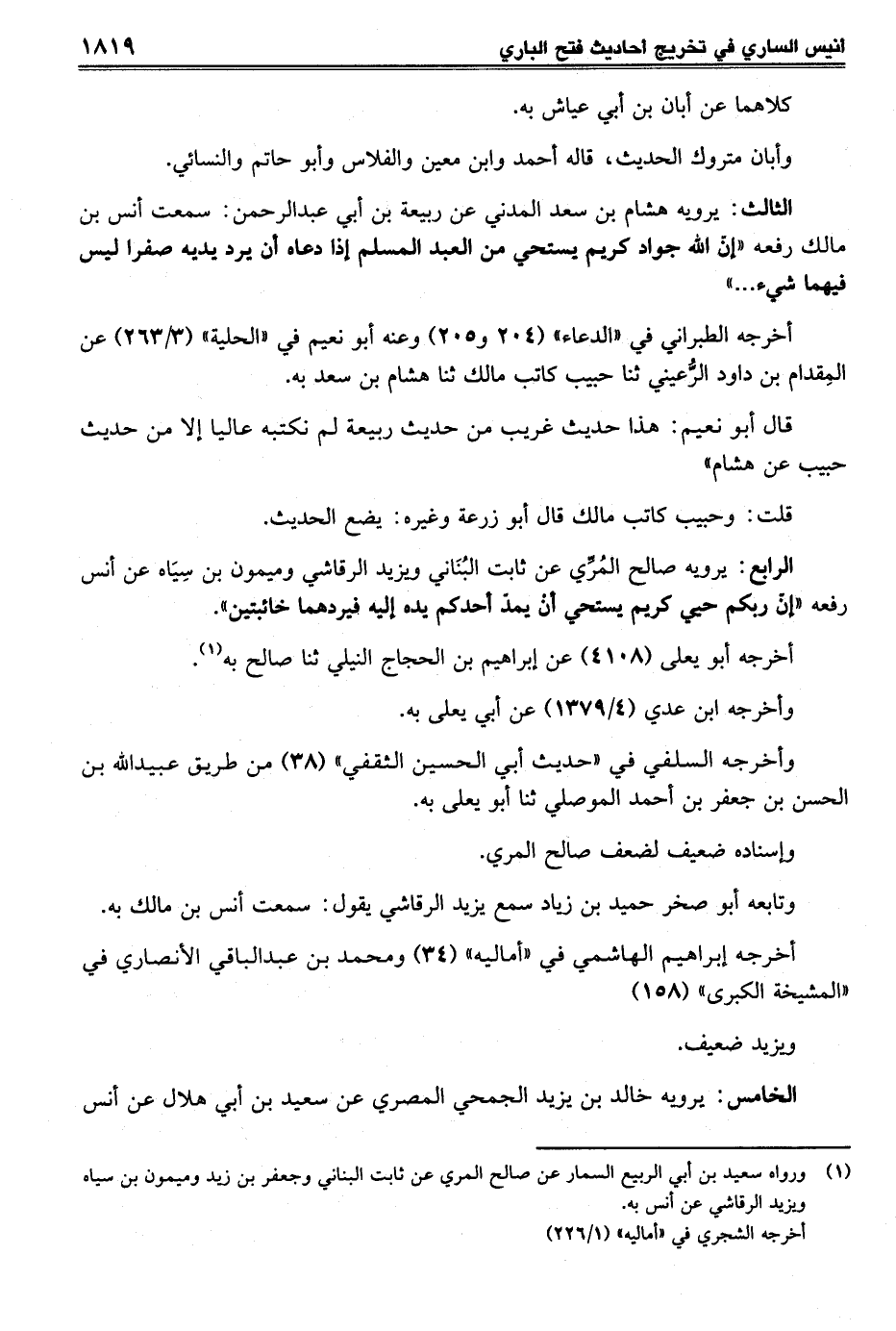 الرابع: يرويه صالح المُرِّي عن ثابت البُنَاني ويزيد الرقاشي وميمون بن سِيَاه عن أنس رفعه "إنّ ربكم حيي كريم يستحي أنّ يمدّ أحدكم يده إليه فيردهما خائبتين".