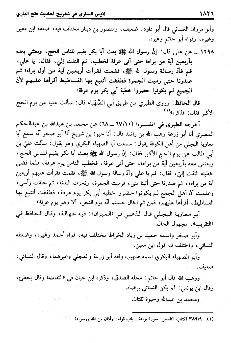 1298 - عن علي قال: إنَّ رسول الله -صلي الله عليه وسلم - بعث أبا بكر يقيم للناس الحج، وبعثني بعده بأربعين آية من براءة حتى أتى عرفة فخطب، ثم التفت إليّ، فقال: يا علي، قم فأدّ رسالة رسول الله -صلي الله عليه وسلم -، فقمت فقرأت أربعين آية من أول براءة ثم صدرنا حتى رميت الجمرة فطفقت أتتبع بها الفساطيط أقرأها عليهم لأنّ الجميع لم يكونوا حضروا خطبة أبي بكر يوم عرفة"