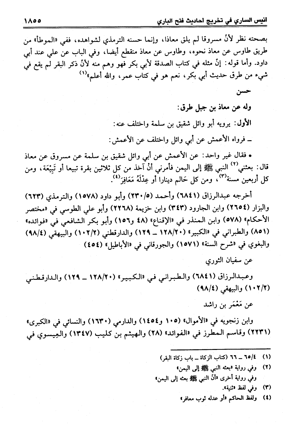 بصحته نظر لأنّ مسروقا لم يلق معاذا، وإنما حسنه الترمذي لشواهده، ففي "الموطأ" من طريق طاوس عن معاذ نحوه، وطاوس عن معاذ منقطع أيضا، وفي الباب عن علي عند أبي داود. وأما قوله: إنّ مثله في كتاب الصدقة لأبي بكر فهو وهم منه لأنّ ذكر البقر لم يقع في شيء من طرق حديث أبي بكر، نعم هو في كتاب عمر، والله أعلم" (¬1)