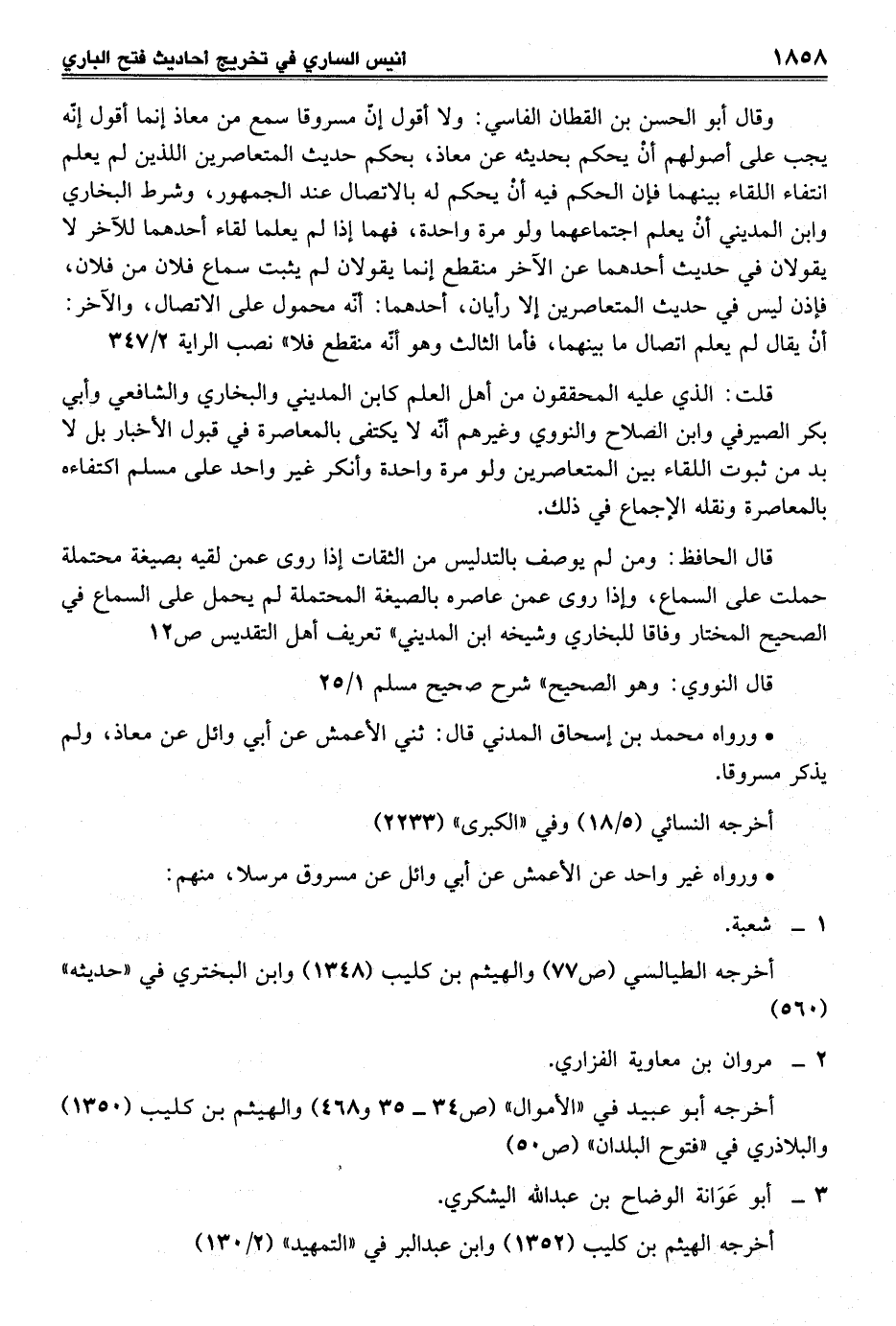 وقال أبو الحسن بن القطان الفاسي: ولا أقول إنّ مسروقا سمع من معاذ إنما أقول إنّه يجب على أصولهم أنْ يحكم بحديثه عن معاذ، بحكم حديث المتعاصرين اللذين لم يعلم انتفاء اللقاء بينهما فإن الحكم فيه أنْ يحكم له بالاتصال عند الجمهور، وشرط البخاري وابن المديني أنْ يعلم اجتماعهما ولو مرة واحدة، فهما إذا لم يعلما لقاء أحدهما للآخر لا يقولان في حديث أحدهما عن الآخر منقطع إنما يقولان لم يثبت سماع فلان من فلان، فإذن ليس في حديث المتعاصرين إلا رأيان، أحدهما: أنّه محمول على الاتصال، والآخر: أنْ يقال لم يعلم اتصال ما بينهما، فأما الثالث وهو أنّه منقطع فلا" نصب الراية 2/ 347