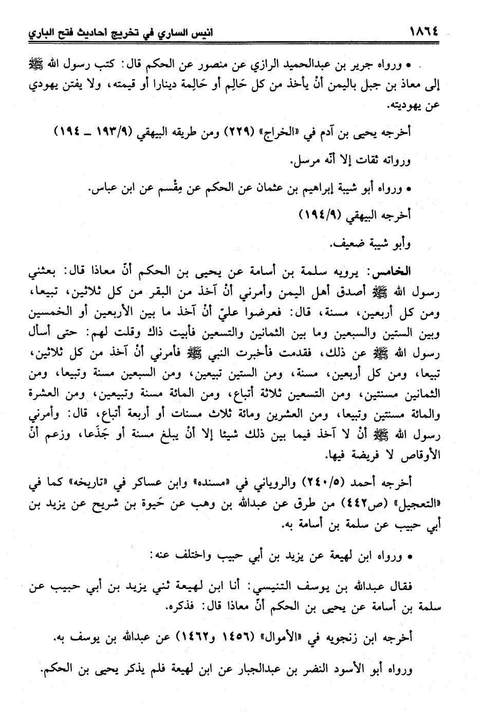 • ورواه جرير بن عبد الحميد الرازي عن منصور عن الحكم قال: كتب رسول الله - صلى الله عليه وسلم - إلى معاذ بن جبل باليمن أنْ يأخذ من كل حَالِم أو حَالِمة دينارا أو قيمته، ولا يفتن يهودي عن يهوديته.