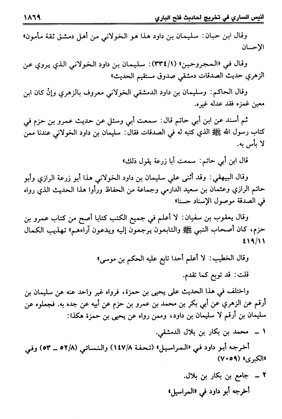 ثم أسند عن ابن أبي حاتم قال: سمعت أبي وسئل عن حديث عمرو بن حزم في كتاب رسول الله - صلى الله عليه وسلم - الذي كتبه له في الصدقات فقال: سليمان بن داود الخولاني عندنا ممن لا بأس به.