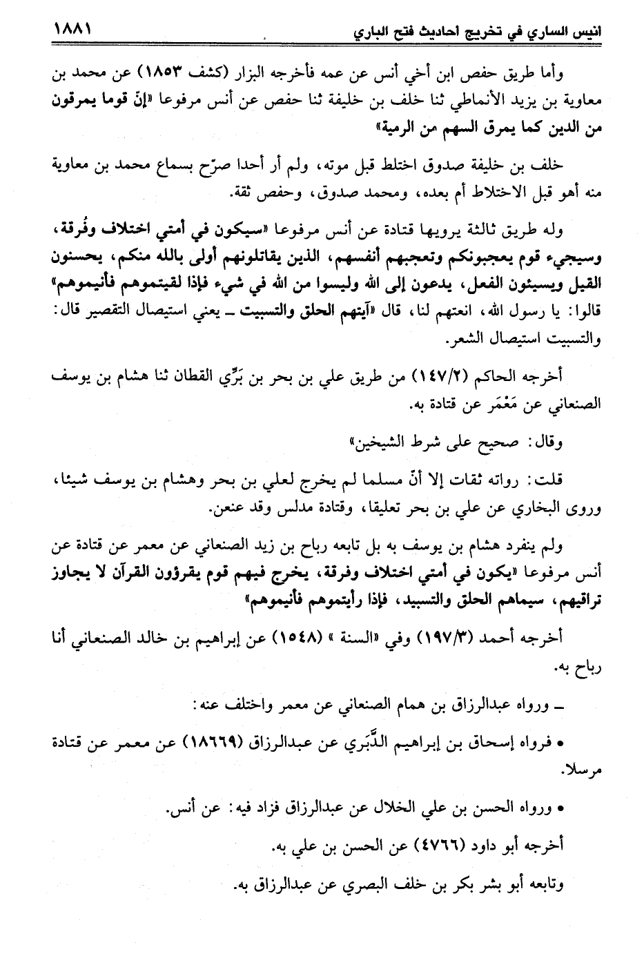 ولم ينفرد هشام بن يوسف به بل تابعه رباح بن زيد الصنعاني عن معمر عن قتادة عن أنس مرفوعا "يكون في أمتي اختلاف وفرقة، يخرج فيهم قوم يقرؤون القرآن لا يجاوز تراقيهم، سيماهم الحلق والتسبيد، فإذا رأيتموهم فأنيموهم"