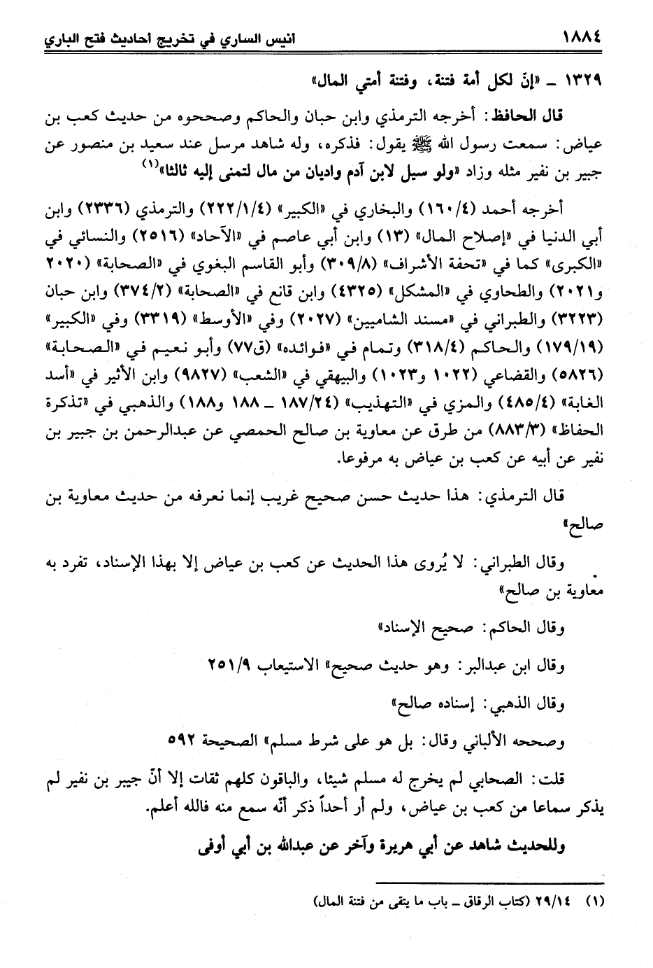 قلت: الصحابي لم يخرج له مسلم شيئا، والباقون كلهم ثقات إلا أنّ جيبر بن نفير لم يذكر سماعا من كعب بن عياض، ولم أر أحداً ذكر أنّه سمع منه فالله أعلم.