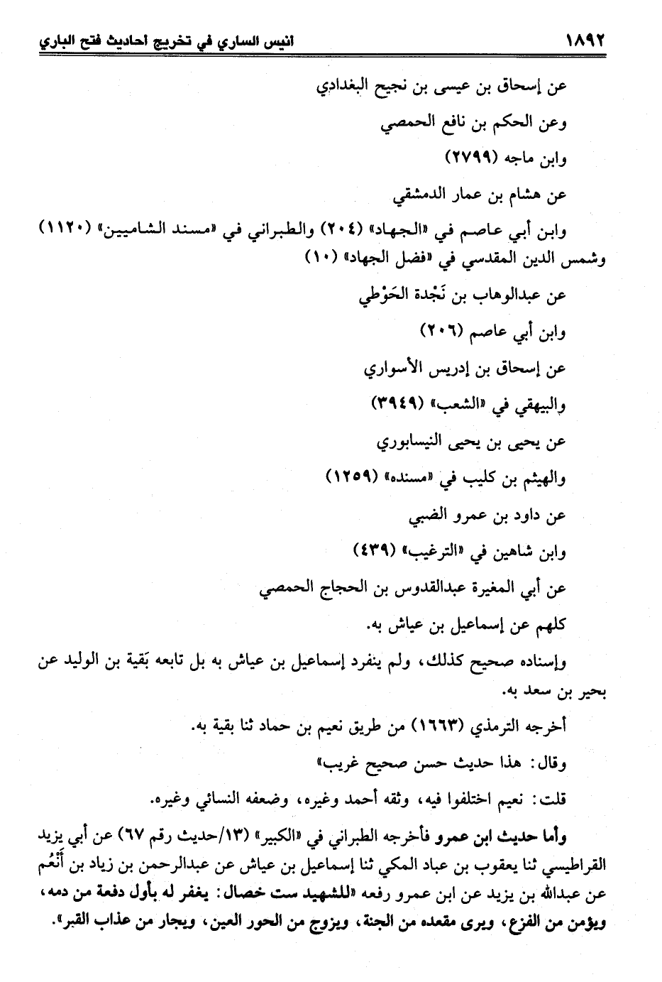 وأما حديث ابن عمرو فأخرجه الطبراني في "الكبير" (13/ حديث رقم 67) عن أبي يِزيد القراطيسي ثنا يعقوب بن عباد المكي ثنا إسماعيل بن عياش عن عبد الرحمن بن زياد بن أَنْعُم عن عبد الله بن يزيد عن ابن عمرو رفعه "للشهيد ست خصال: يغفر له بأول دفعة من دمه، ويؤمن من الفزع، ويرى مقعده من الجنة، ويزوج من الحور العين، ويجار من عذاب القبر".