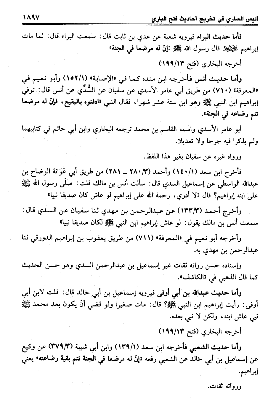 وأما حديث عبد الله بن أبي أوفى فيرويه إسماعيل بن أبي خالد قال: قلت لابن أبي أوفى: رأيت إبراهيم ابن النبي - صلى الله عليه وسلم -؟ قال: مات صغيرا ولو قضي أنْ يكون بعد محمد - صلى الله عليه وسلم - نبي عاش ابنه، ولكن لا نبي بعده.