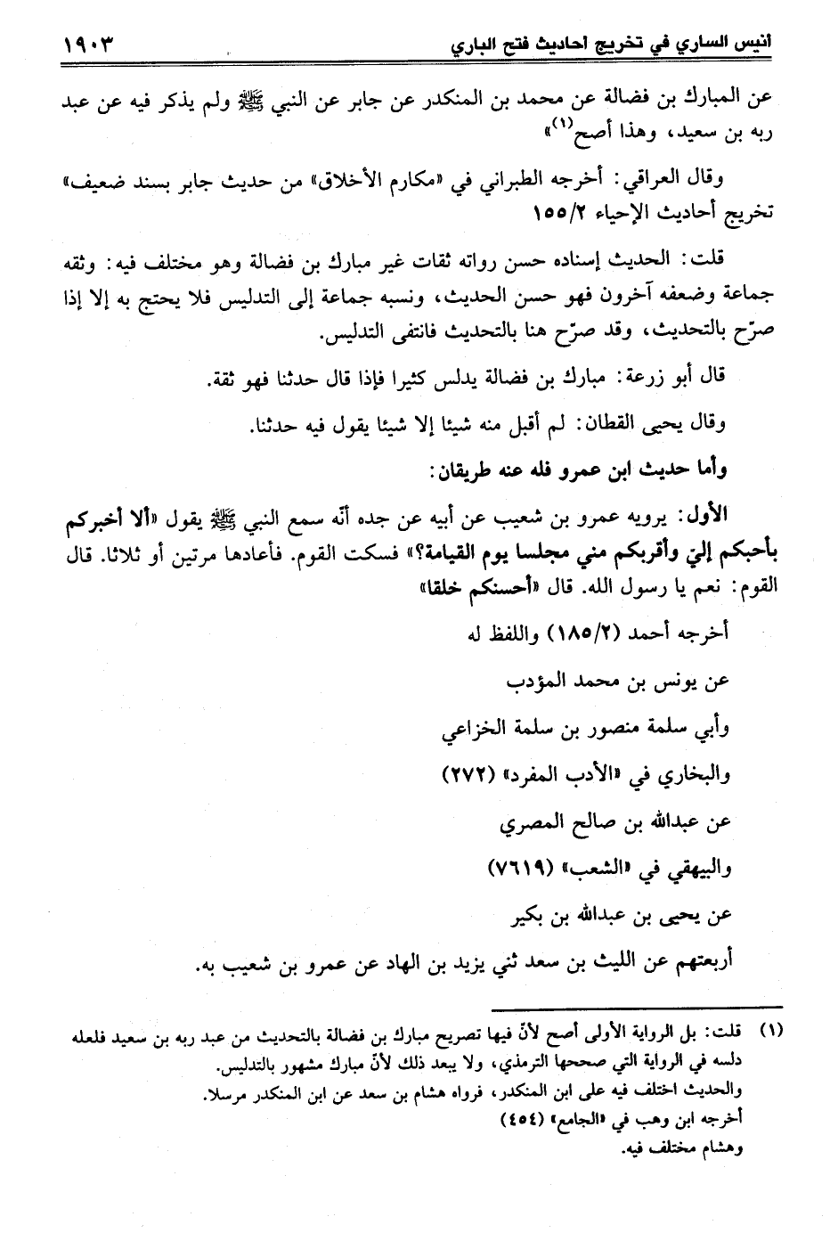 (¬1) قلت: بل الرواية الأولى أصح لأنّ فيها تصريح مبارك بن فضالة بالتحديث من عبد ربه بن سعيد فلعله دلسه في الرواية التي صححها الترمذي، ولا يبعد ذلك لأنّ مبارك مشهور بالتدليس.