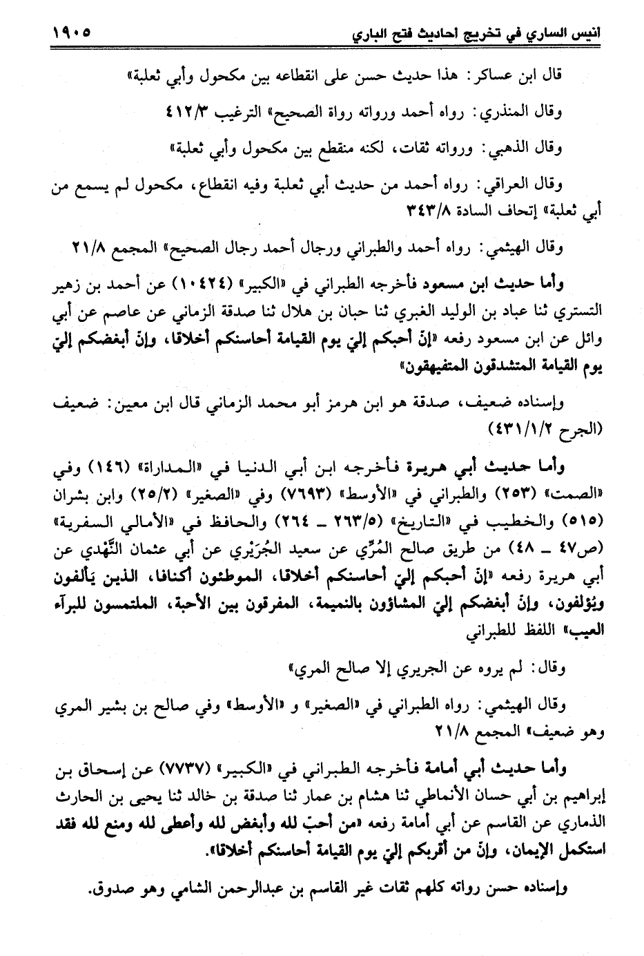 وأما حديث أبي هريرة فأخرجه ابن أبي الدنيا في "المداراة" (146) وفي "الصمت" (253) والطبراني في "الأوسط" (7693) وفي "الصغير" (2/ 25) وابن بشران (515) والخطيب في "التاريخ" (5/ 263 - 264) والحافظ في "الأمالي السفرية" (ص 47 - 48) من طريق صالح المُرِّي عن سعيد الجُرَيْري عن أبي عثمان النَّهْدي عن أبي هريرة رفعه "إنّ أحبكم إليّ أحاسنكم أخلاقا، الموطئون أكنافا، الذين يَألفون ويُؤلفون، وإنّ أبغضكم أليّ المشاؤون بالنميمة، المفرقون بين الأحبة، الملتمسون للبرآء العيب" اللفظ للطبراني