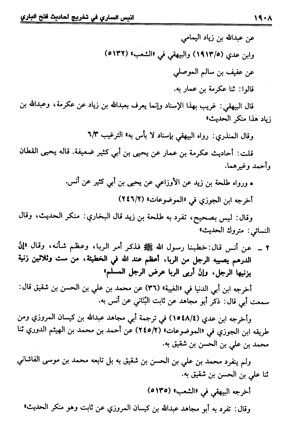 2 - عن أنس قال: خطبنا رسول الله - صلى الله عليه وسلم - فذكر أمر الربا، وعظم شأنه، وقال "إنّ الدرهم يصيبه الرجل من الربا، أعظم عند الله في الخطيئة، من ست وثلاثين زنية يزنيها الرجل، وإنّ أربى الربا عرض الرجل المسلم"
