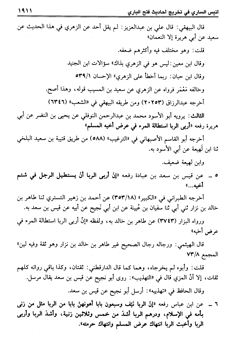 الثالث: يرويه أبو الأسود محمد بن عبد الرحمن النوفلي عن يحيى بن النضر عن أبي هريرة رفعه "أربى الربا استطالة المرء في عرض أخيه المسلم"