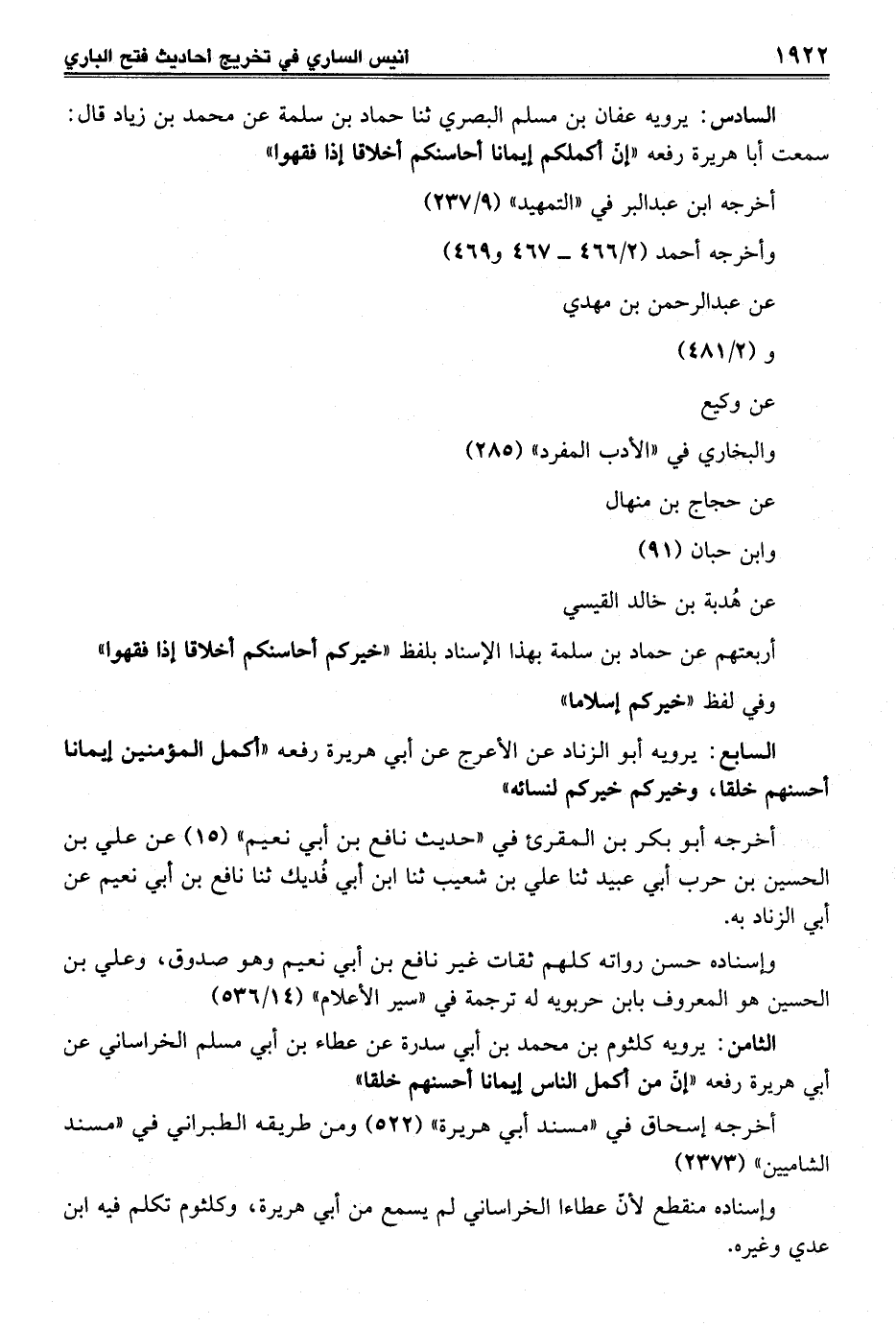 السادس: يرويه عفان بن مسلم البصري ثنا حماد بن سلمة عن محمد بن زياد قال: سمعت أبا هريرة رفعه "إنّ أكملكم إيمانا أحاسنكم أخلاقا إذا فقهوا"
