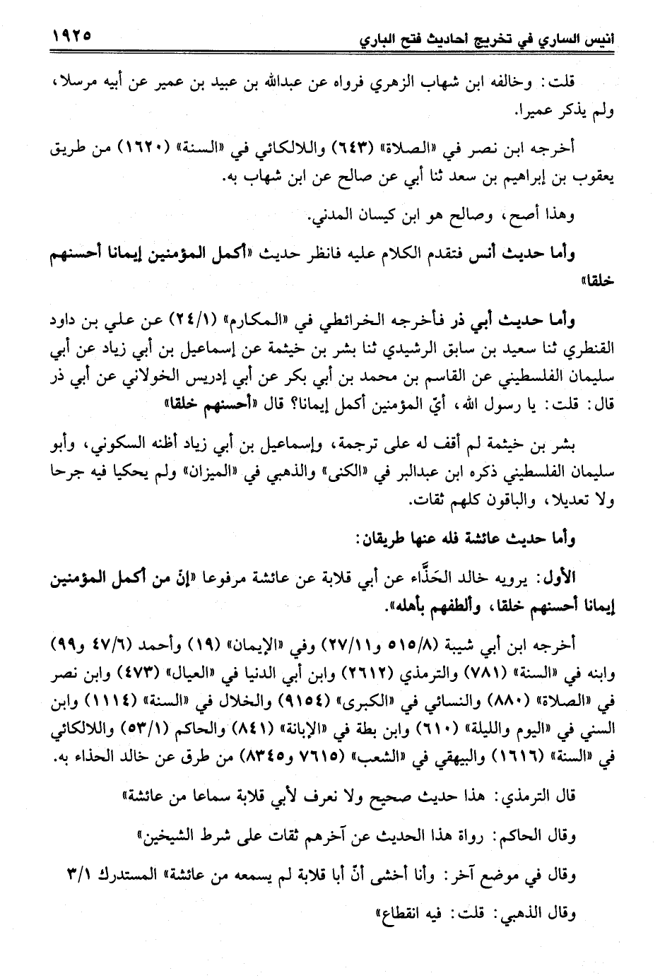 الأول: يرويه خالد الحَذَّاء عن أبي قلابة عن عائشة مرفوعا "إنّ من أكمل المؤمنين إيمانا أحسنهم خلقا، وألطفهم بأهله".