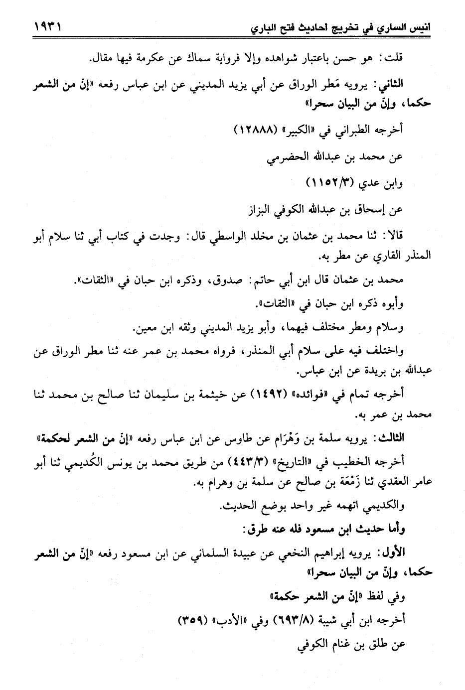 الثاني: يرويه مَطر الوراق عن أبي يزيد المديني عن ابن عباس رفعه "إنّ من الشعر حكما، وإنّ من البيان سحرا"